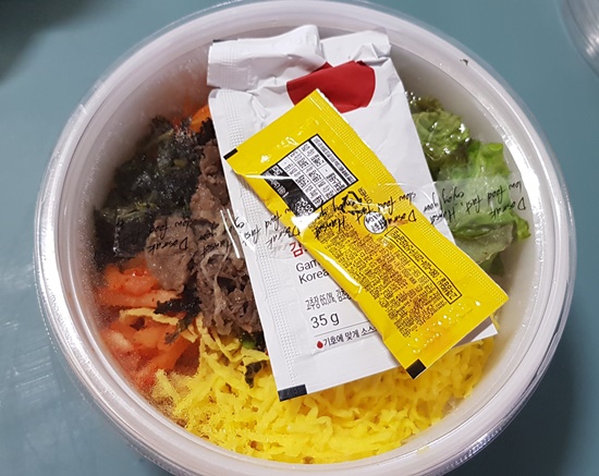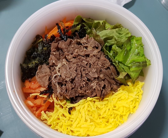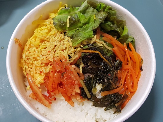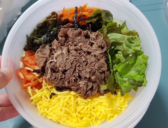 비빔밥 재료와 밥이 담겨진 종이 그릇에