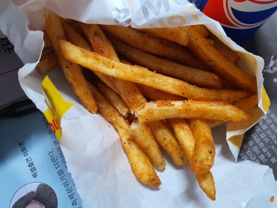 맘스터치 인기메뉴 싸이버거 세트를 주문하고